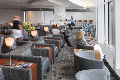 Concourse E: Airside - The lounge is located in the atrium at the top of the escalators to the left.